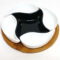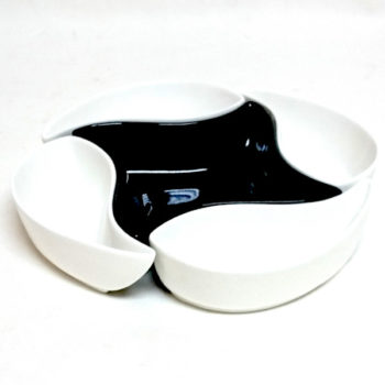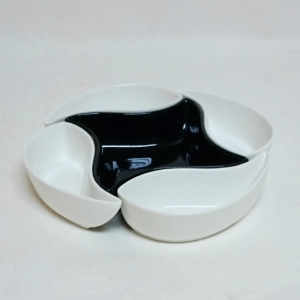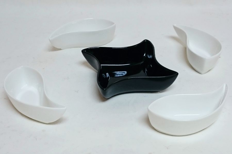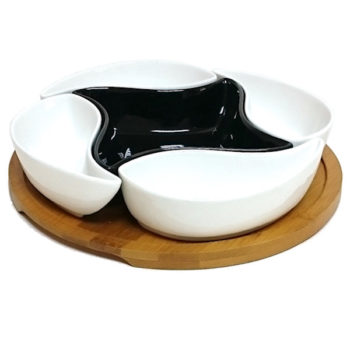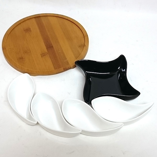 Порцелански сет за сервирање, составен од дрвено постоље (бамбус) и пет порцелански садови (4 бели и 1 црн) погодни за служење на салати и апетисани.